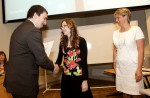 Fotol annab Tiigrihüppe Sihtasutuse koolitusvaldkonna juht Urmo Uiboleht preemia üle Surju kooli direktor Heidi Kodasmale (paremal) ja õpetaja Signe Reidlale. Foto: Terje Lepp.